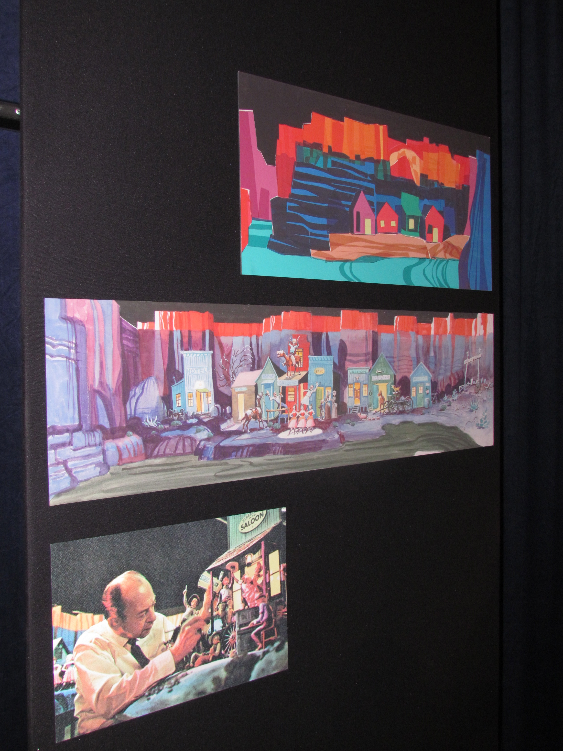In the final room, we set Peter Ellenshaw’s painting of Disneyland, done about a year before the park opened. One of the amazing things Ellenshaw did with this painting is to use some black light paint that was around for use in some attraction, and go over the entire painting dotting in streetlights, lights in windows, and other details that could only be seen under black light. We were told the painting has never been shown to the public this way; and were then able to view the painting under normal lighting (Disneyland by day) and then under black light (Disneyland at night). I think if Imagineering were to find a way to reproduce this, they could have sold one to just about every person that toured the exhibit — I know I would have bought one!