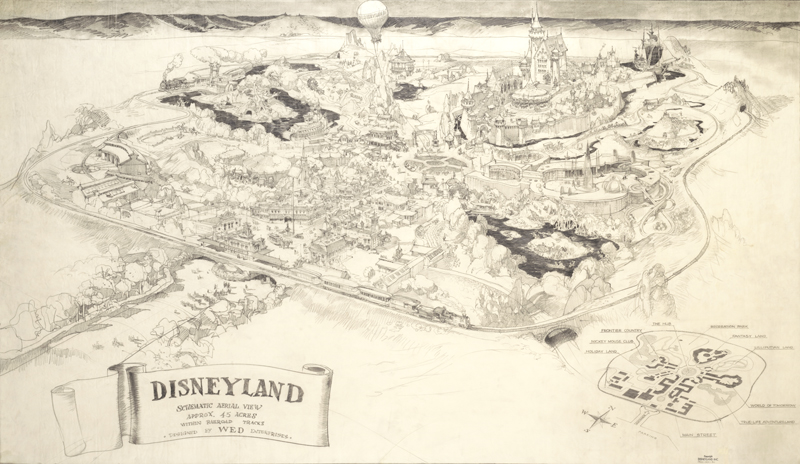 In the second room, we see perhaps the most famous Imagineering drawing of all time — Herb Ryman’s original pencil sketch of Disneyland. This was not one of the many reproductions, but the actual original. I believed that I had seen this before somewhere … perhaps in the Disney Gallery? — but after seeing it here, now I suspect I had never before seen the original. The reason I suspect that is on this drawing, you can very clearly see the paper is not flat — indentations are very obvious where Herb shaded in areas vigorously, and I had never noticed that before on any version of the drawing I had seen.